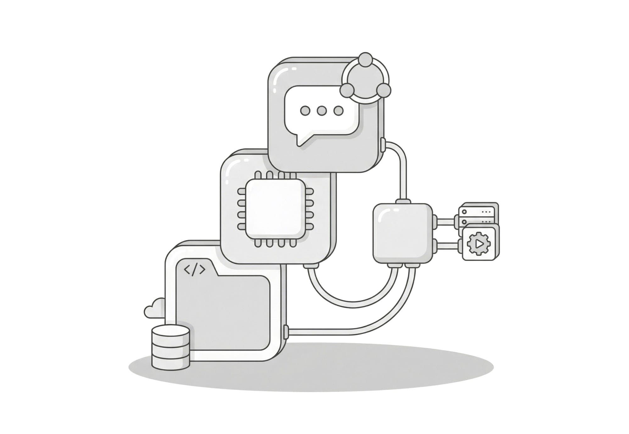 Traditional code, APIs, databases, and infrastructure. The foundation that still runs most systems and handles deterministic logic.