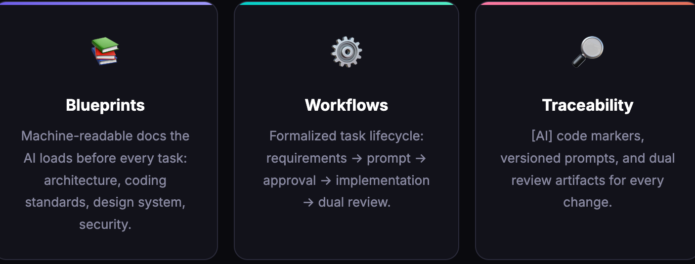 AI needs constraints. Unconstrained AI produces creative chaos. Constrained AI — given blueprints, rules, and a task lifecycle — produces auditable, pattern-conforming code.