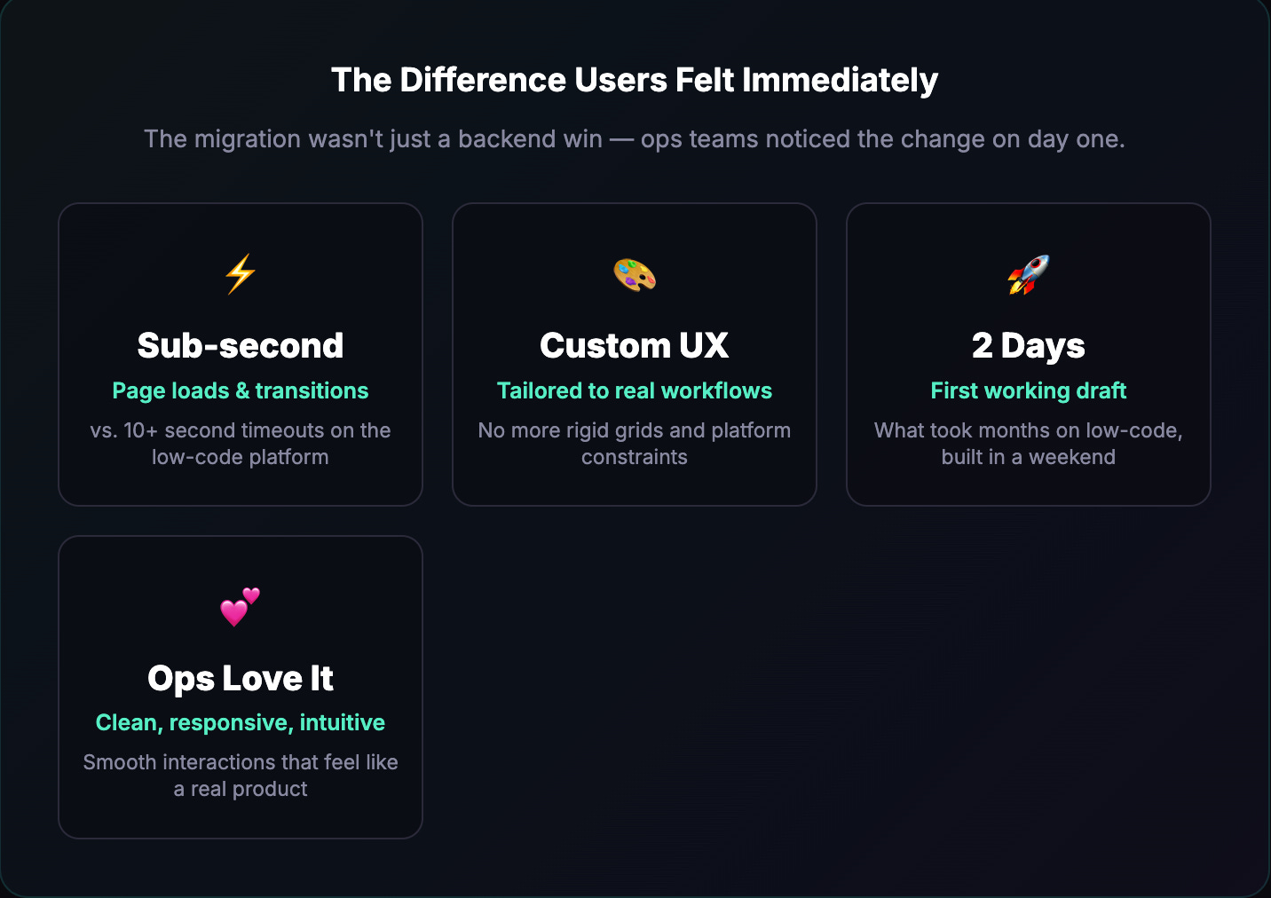 Day 5: Presented to the CEO and management team. Everyone was convinced — not just by the speed, but by the user experience. Clean interfaces. Sub-second load times. Smooth interactions. Responsiveness that the low-code platform couldn’t touch.