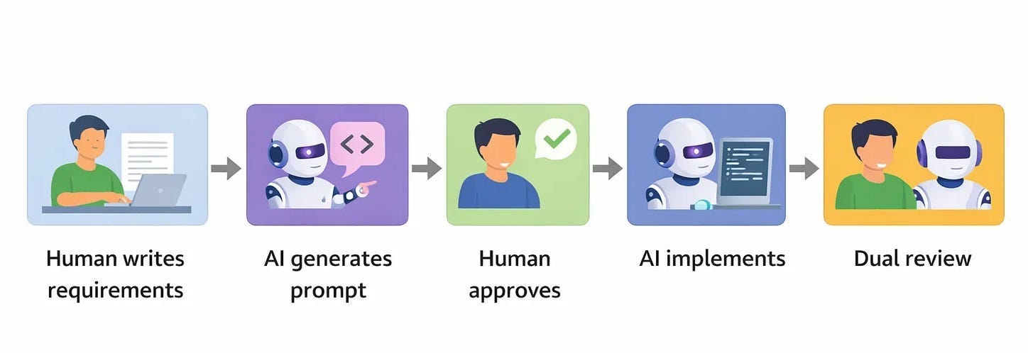 The human writes the requirements. The AI generates a prompt from those requirements. A human approves that prompt before anything is implemented. The AI implements. Then dual review — both AI and human — before merge. This isn’t bureaucracy; it’s the audit trail that makes AI-generated code trustworthy in a production environment handling PII and financial data.