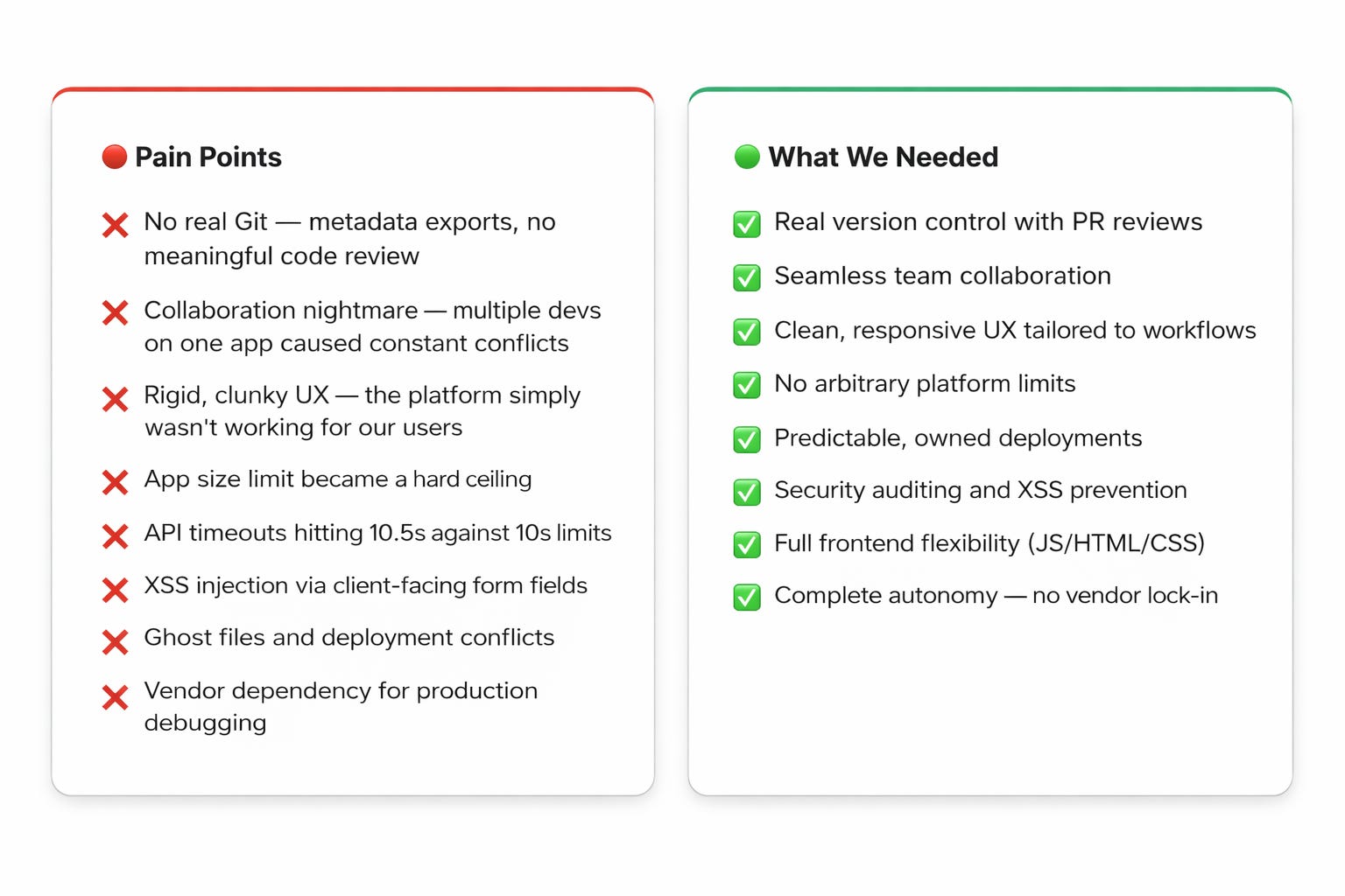 The collaboration story was the most painful part. Multiple developers working on the same app caused constant conflicts. There was no real version control, no meaningful code review — just metadata exports and hope. The UX was rigid in ways our users felt every day. App size limits became a hard ceiling. API timeouts were hitting 10.5 seconds against a 10-second limit. Ghost files. Deployment conflicts. Performance timeouts. War-room mode became the norm.