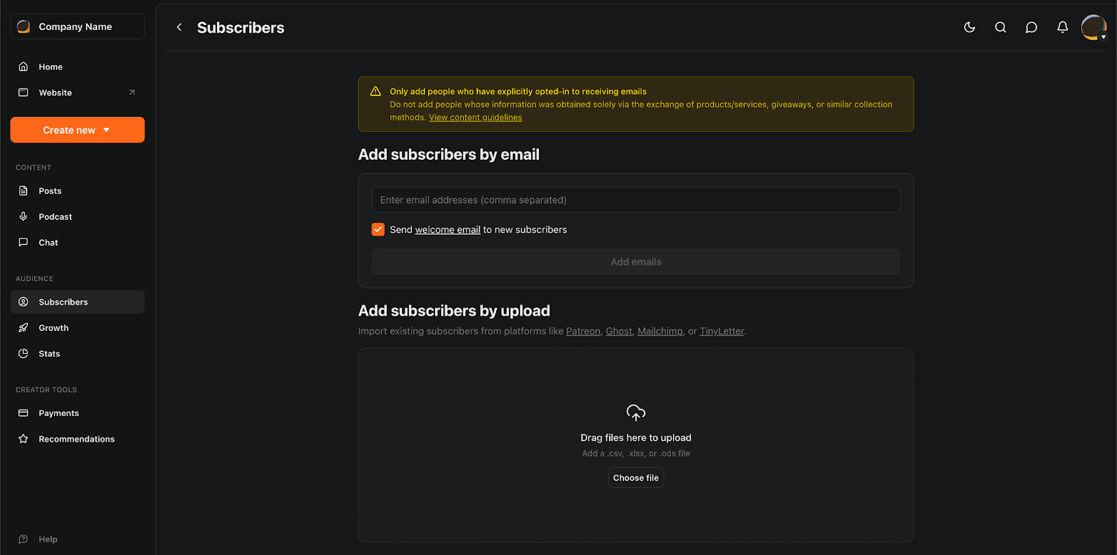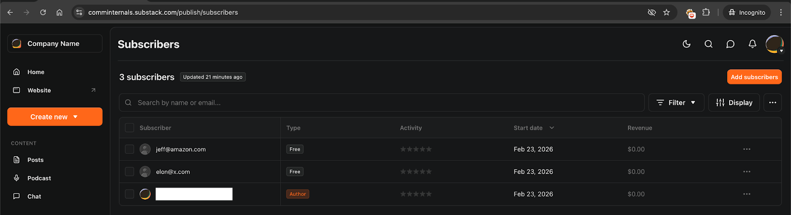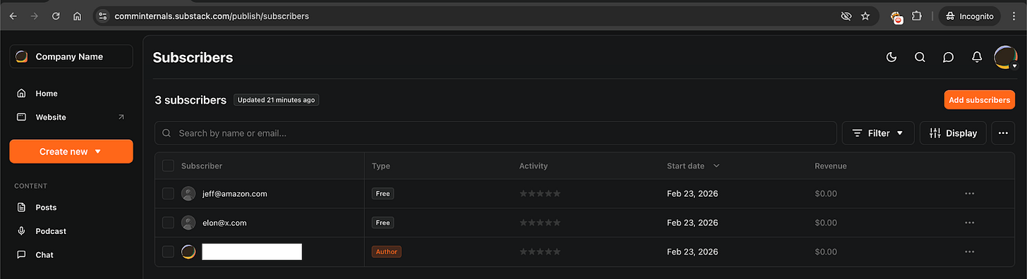 When you register on Substack, the application asks for a handle. Let’s say we choose the handle comms-internal. The email created based on that handle would be comms-internal@substack.com.