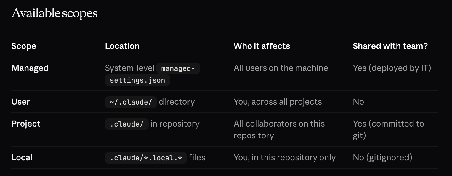 During the evaluation, I came across Claude Code settings, which allow us to configure Claude Code with global and project-level settings, as well as environment variables. The JSON file contains multiple scopes and parameters, which we identified during our review of the documentation.
