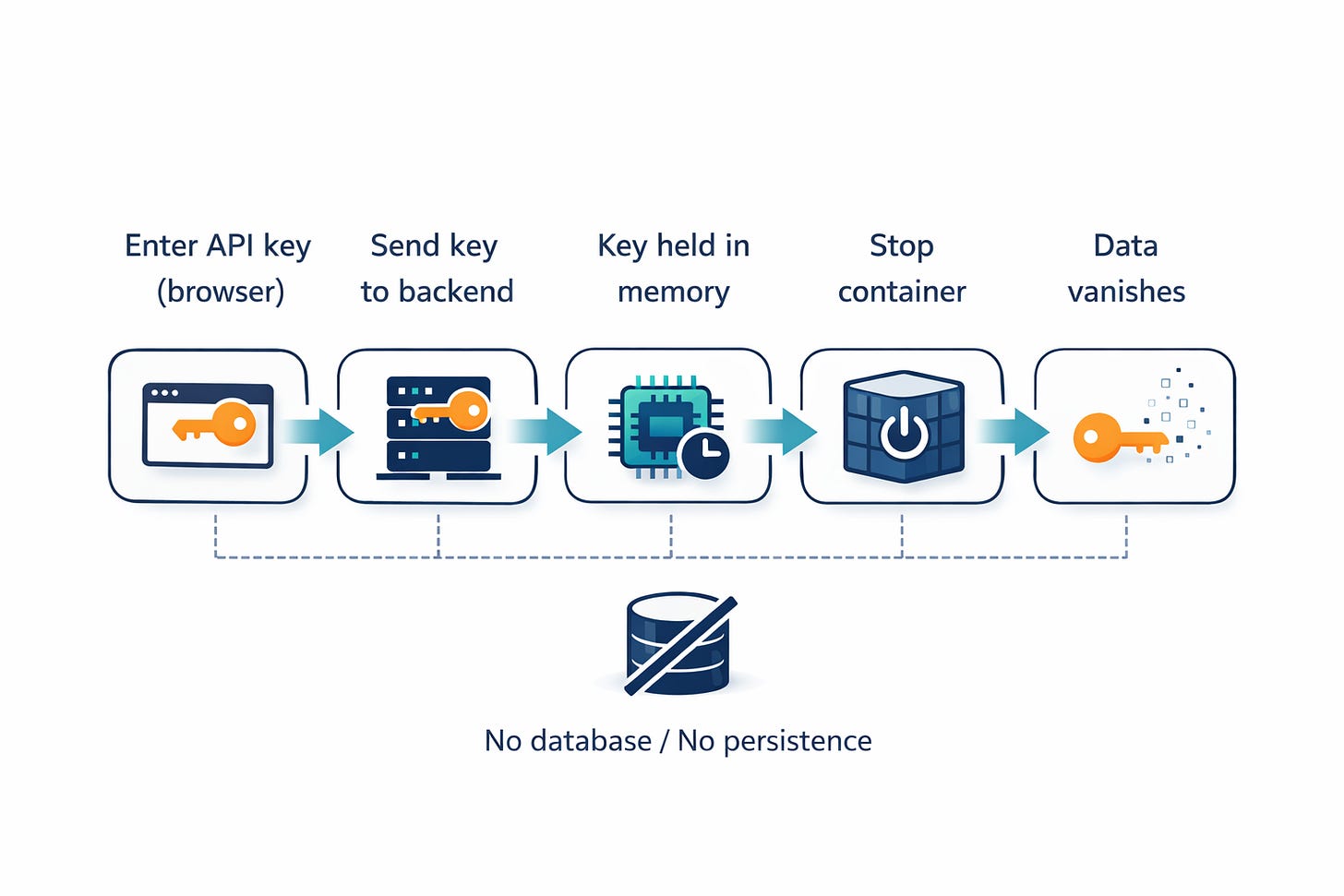 Key safety: Never store API keys in a back-end database.